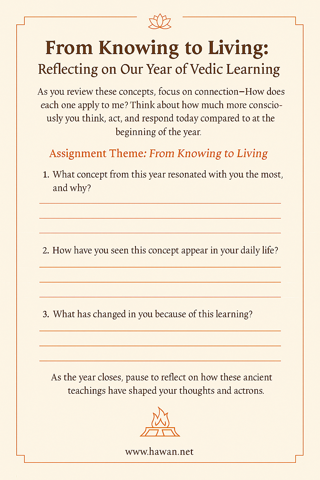 Again, this exercise is not about recalling facts. It is about realization — how ancient teachings have begun to influence your life. By revisiting each concept, you strengthen the connection between what you’ve learned and who you are becoming. As the year closes, we just take a pause – not stop – to let the knowledge we’ve gathered settle within us, quietly shaping our thoughts and actions. That is how Vedic wisdom lives – not just in books, but in hearts.
