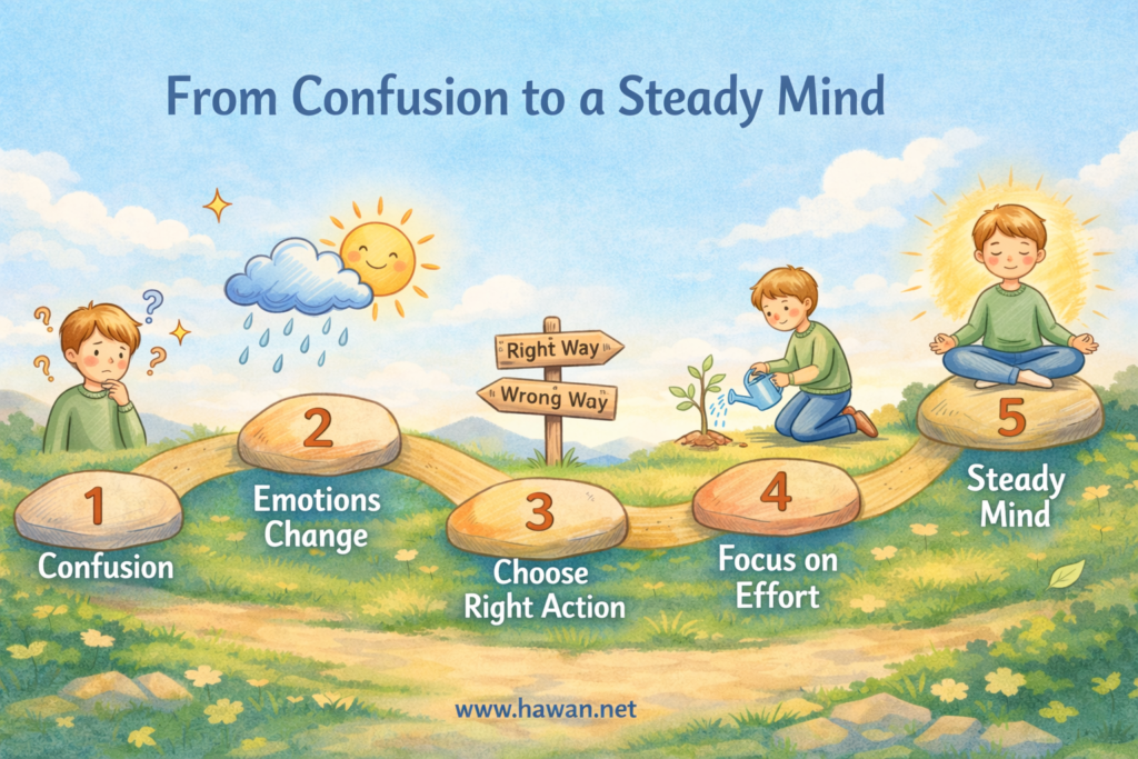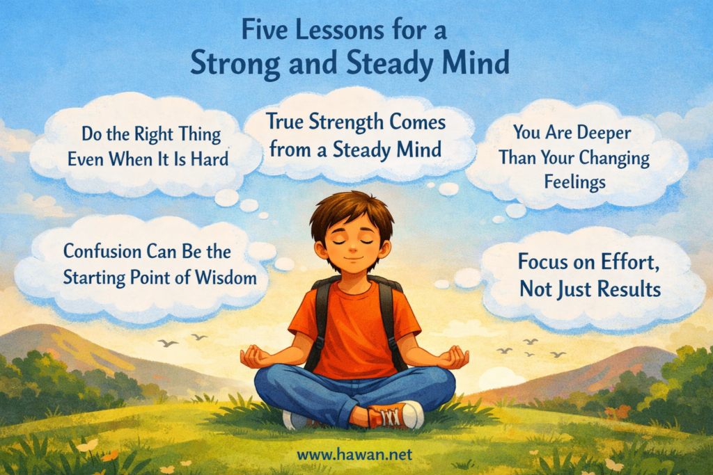 A helpful way to understand Chapter 2 is through five simple ideas that you can carry into everyday life. First, confusion can be the starting point of wisdom. Second, you are deeper than your changing feelings and situations. Third, you grow by doing the right thing, even when it is hard. Fourth, you should focus on your effort rather than getting stuck on results. And fifth, true strength comes from a steady mind. Together, these five ideas give you a framework for understanding not only Arjuna’s journey, but also your own thoughts, choices, and struggles.